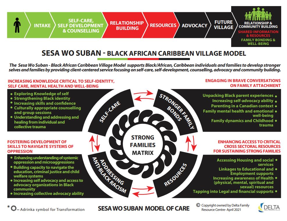 Sesa Wo Suban is Delta Family’s model for working with Black communities. It is grounded in Africentric values and developed to support Black families successfully navigate life’s challenges. This model, with some adjustments, can also be applied to work with other communities – particularly other racialized communities.